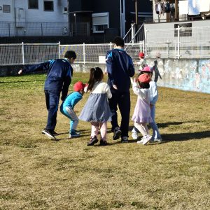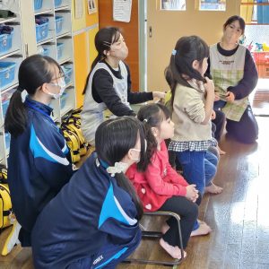 西谷中学校から4人のボランティアのお兄さん、お姉さんがご来園くださいました。最初は子供たちもお兄さんたちも少し緊張していましたが、一緒に遊んでいるうちにすっかり打ち解けて楽しい時間を過ごすことができました。少しでも保育園や保育士のお仕事に興味を持って頂き、嬉しく思います。ありがとうございました。